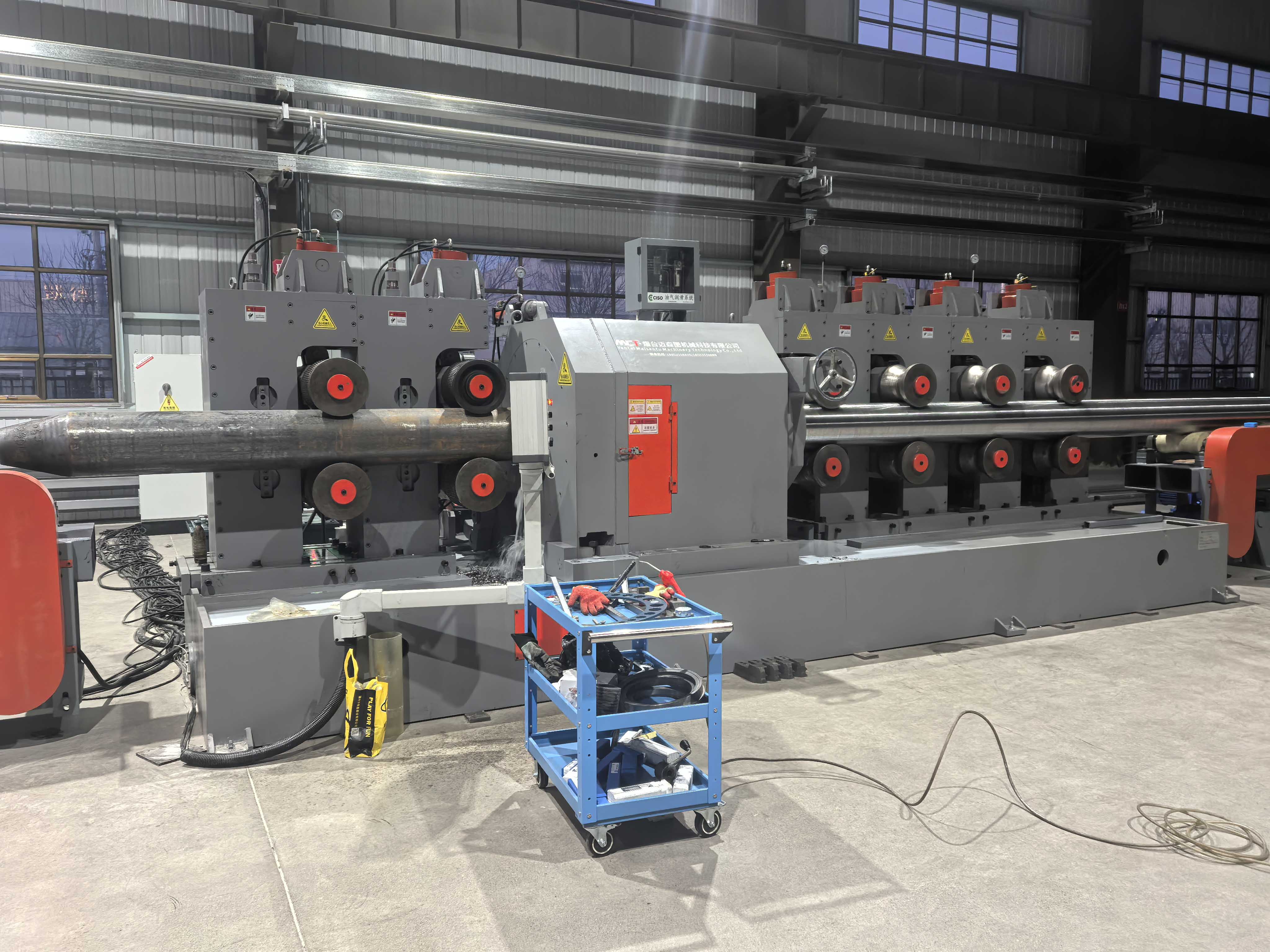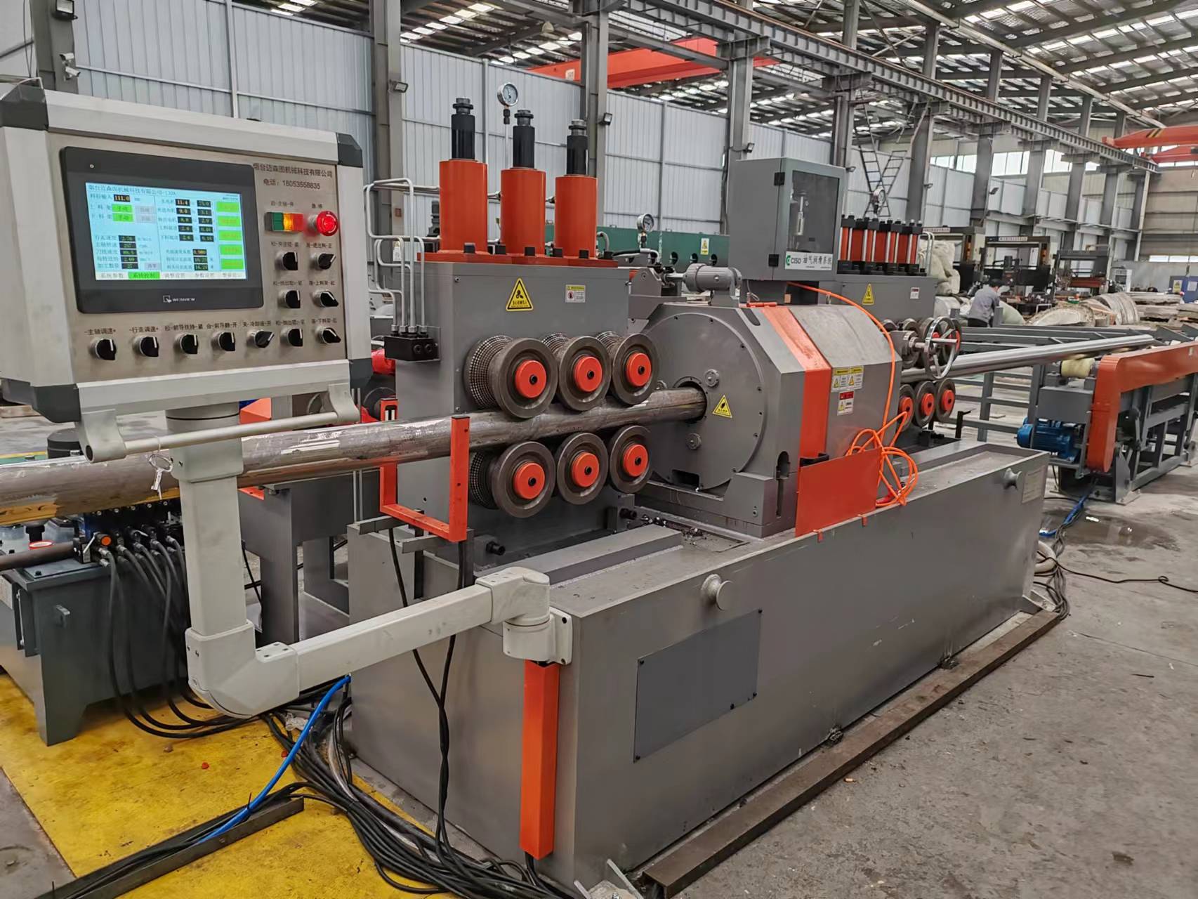 辊子的位置与被矫直制品运动方向成某种角度,两个或三个大的是主动压力辊,由电动机带动作同方向旋转;另一边的若干个小辊是从动压力辊,它们是靠着旋转着的圆棒或管材摩擦力使之旋转的。